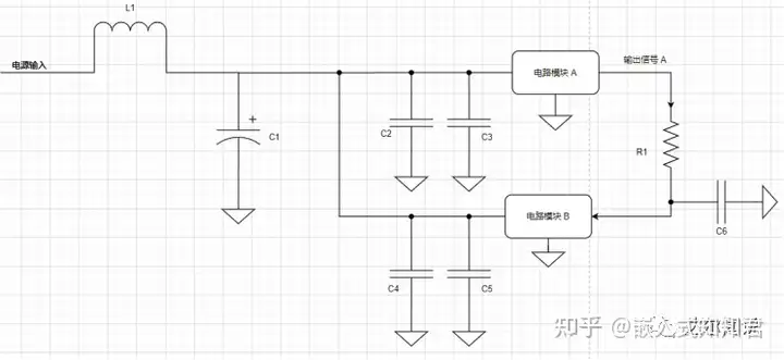 此处,我们再往深处延伸一点,讲一下去耦和旁路电容。这里就不得不忽略寄生参数的影响了,特别是高频电路,相比于常规的电子电路,研究的就是寄生参数的影响。如果把电源输出直至电路模块整个系统纳入考虑,电源输出与电路模块A之间的导线实际上就是寄生电感。