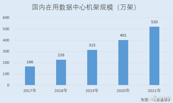 据中国信息通信研究院数据,2017-2021年,国内在用数据中心机架规模分别为166万架、226万架、315万架、401万架、520万架,复合增长率达33.04%。