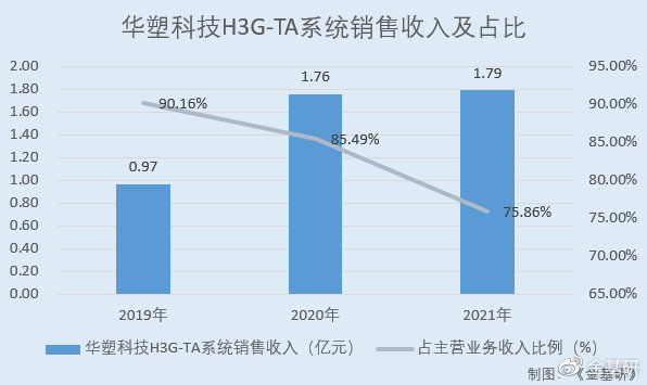 2019-2021年,华塑科技H3G-TA系统销售收入逐年上升,分别为0.97亿元、1.76亿元、1.79亿元,占主营业务收入比例分别为90.16%、85.49%、75.86%。