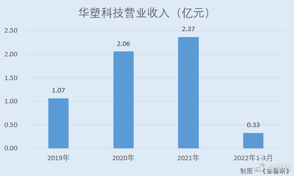 据招股书,2019-2021年及2022年1-3月,华塑科技营业收入分别为1.07亿元、2.06亿元、2.37亿元、0.33亿元。其中,2022年1-3月财务数据经天健会计师事务所审阅未审计,下同。