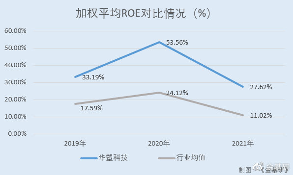 据东方财富Choice数据,2019-2021年,华塑科技加权平均ROE分别为33.19%、53.56%、27.62%。