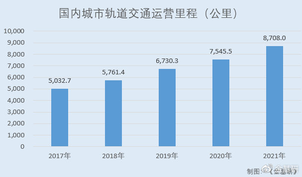 在轨道交通领域,近年来国内轨道交通稳步发展,城市轨道交通运营里程持续增长。据交通运输部数据,2017-2021年,国内城市轨道交通运营里程分别为5,032.7公里、5,761.4公里、6,730.3公里、7,545.5公里、8,708.0公里。