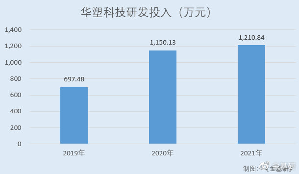 在研发投入方面,华塑科技一贯重视科研资金投入,保持持续研发投入。2019-2021年,华塑科技研发投入分别为697.48万元、1,150.13万元、1,210.84万元。