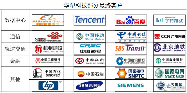 目前,华塑科技与维谛集团、力维智联、共济科技、高新兴、万国数据、科华数据、南都电源等系统集成商、数据中心运营商、电源厂商以及其他企事业单位建立了长期稳定的合作关系,产品最终服务于阿里巴巴、腾讯、百度、字节跳动、中国移动、中国联通、中国电信、国家电网、中国银行、工商银行、杭州地铁、新加坡地铁、中石油、中石化等国内外知名企业,客户遍及东南亚、美洲、欧洲等40多个国家和地区。