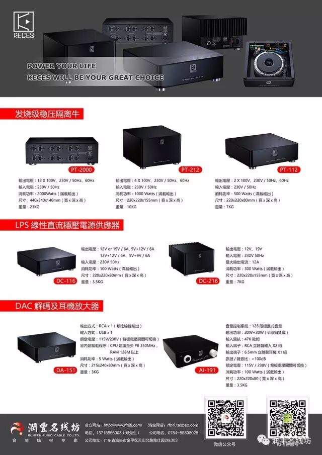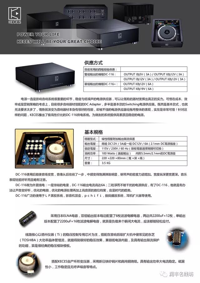 近月,看见润丰名线坊的广告,得悉他们已取得台湾KECES电源产品的全国总代理,KECES专营稳压隔离牛、LP线性直流稳压电源、DAC解码、耳机放大器等等,其中一台型号DC-116备有多款直流电压输出组合可供选择,这正是笔者想要的,遂联系润丰名线坊送来测试。