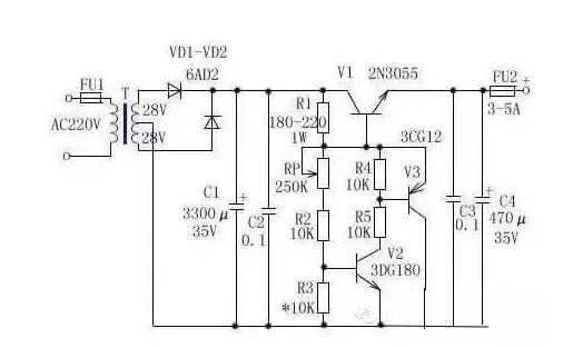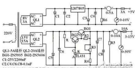无论检修电脑还是电子制作都离不开稳压电源,下面介绍一款直流电压从3V到15V连续可调的稳压电源,最大电流可达10A,该电路用了具有温度补偿特性的,高精度的标准电压源集成电路TL431,使稳压精度更高,如果没有特殊要求,基本能满足正常维修使用,电路见下图。