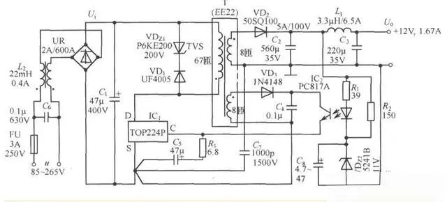 2、TOP224P构成的12V、20W开关直流稳压电源电路