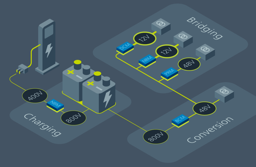 使用基于 SAC 的器件,不仅可缩小电源网络组件的尺寸,而且允许电源工程师采用大量不同的方式优化供电网络。电池电压可轻松转换为 48V,并在负载点从 48V 网络降至 12V。使用 Vicor 高压 BCM®母线转换器,能轻松实现从主电池 (400/800V) 到 48V 的转换。BCM 仅重 58 克,体积仅为 0.016L,可提供 2.5kW 的 48V 电源。48V 电源可使用高效 ZVS PRM™ 稳压器稳压,其重量仅为 40 克,体积为 0.01L。