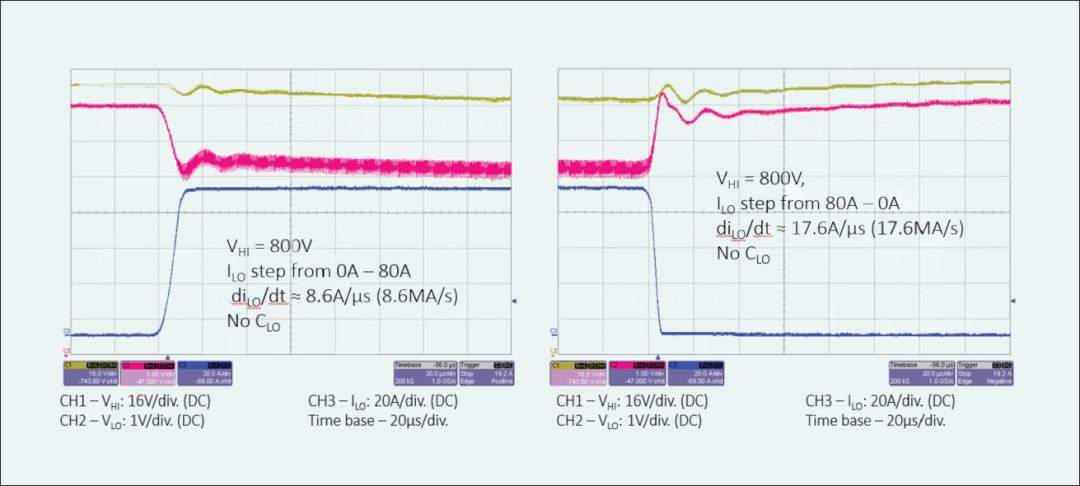 图 3:SAC拓扑具有极快的瞬态响应性能。这里的基准测试显示:在瞬态率为8.6MA/s的情况下,加载步长为0~80A,也就是说空载至满负载用时不足10µs,速度明显比使用电池快。80~0A的加载步长的转换速率甚至更快,达到17.6MA/s瞬态率。