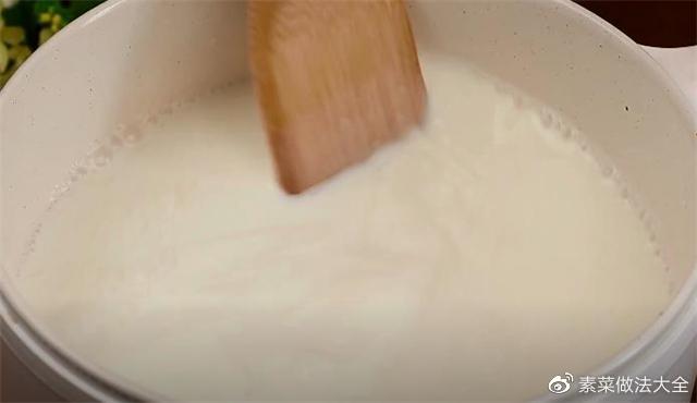 4.往锅里面加入500毫升的纯牛奶,加入40g的白凉粉,再加入30g白糖,开小火不停的搅拌均匀至煮开。