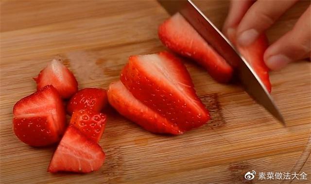 3.接着再给大家分享一个草莓的新鲜吃法,把草莓切成小块。