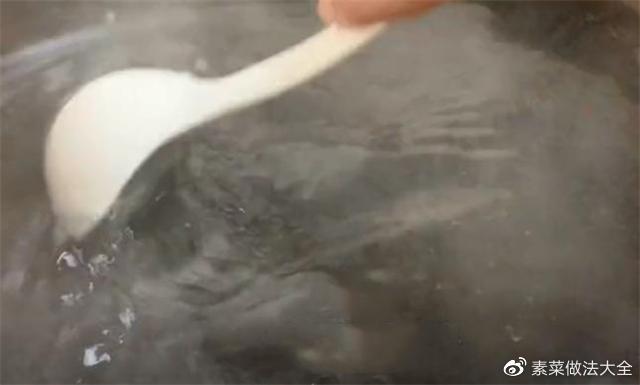 5.锅里面的水完全煮开以后,像这种翻滚的状态时,往锅里面倒入一碗冷水,这里要记住是冷水哦,不是刚才舀出来的温水,这样做是为了让锅中的温度快速的降下来,把温度降下来是为了防止饺子因为温度过高而一直涨肚造成破皮,这样饺子就不容易破皮。