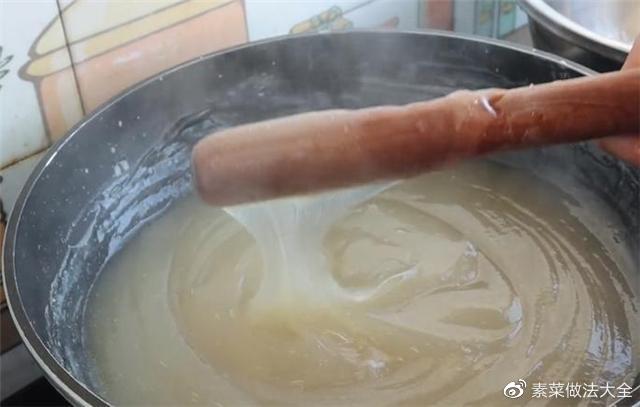 2.做凉粉,淀粉和水的比例是1:5,刚才用了一碗水,现在再往锅里倒入剩余的4碗水进去,锅里的水不需要烧开,把水烧到微热的时候转小火,然后把刚才搅好的淀粉液慢慢地倒入锅里面,边缓慢倒入,边用筷子不停地搅拌,如果锅里的水温过高的话,淀粉液刚倒入锅里就会凝固变稠,形成疙瘩,这样做的凉粉就没有那么光滑了,全程用最小火,随着锅里温度的慢慢升高,淀粉液也会慢慢地变稠,一直用擀面杖朝同一个方向不停地搅拌,这样做凉粉不仅不会有疙瘩,还能防止粘锅,这个是越搅越光滑,越嚼越筋道,锅里的颜色也会慢慢变得透明,我这里大概搅了有20分钟左右,最后搅成这种比较透明的状态就可以了,然后盖上锅盖继续转最小火焖5分钟左右,这样能够保证锅里的凉粉完全熟透。