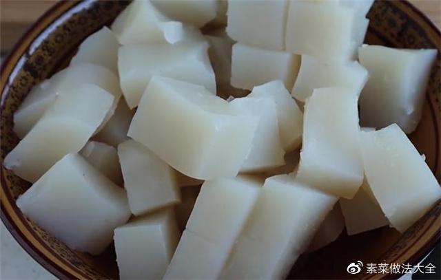 5.接下来给大家分享一下炒凉粉的做法,把凉粉切成小块。