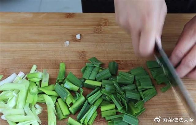 6.准备一把洗干净的蒜苗,把蒜苗斜切成段,这样更加容易地入味,把切好的蒜苗和蒜叶分开装盘。