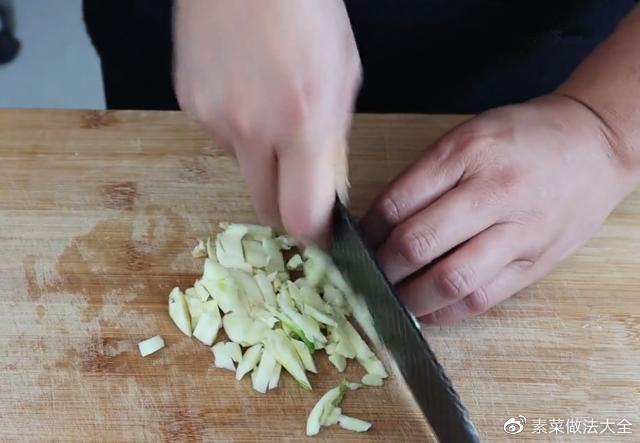 7.再多准备几个大蒜,把大蒜压扁,全部切成蒜末备用。