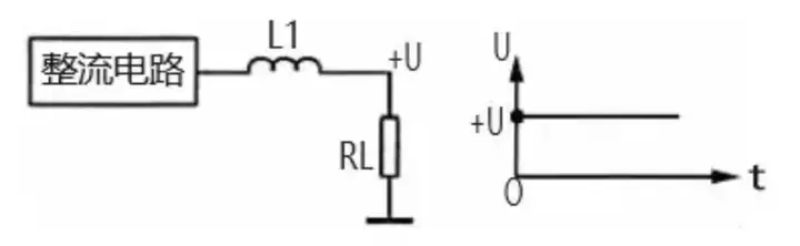 图3所示是电感滤波原理图。由于电感L1对直流电相当于通路,这样整流电路输出的直流电压直接加到负载RL上。对于整流电路输出的交流成分,因L1电感量较大,感抗较大,对交流成分产生很大的阻碍作用,阻止了交流电通过C1流到负载RL。这样,通过电感L1的滤波,从单向脉动性直流电中取出了所需要的直流电压+U。滤波电感L1的电感量越大,对交流成分的感抗越大,使残留在负载RL上的交流成分越小,滤波效果就越好,但直流电阻也会增大。