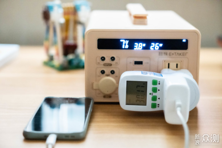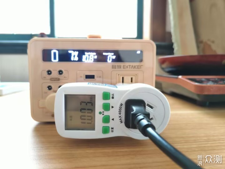 (户外光线太好, 屏幕有点拍不清,但是实际上电子产品的功率本身不大,距离1000W的额定功率还有很多距离,大家可以放心使用,在户外你给这款移族P1000S插满也是不影响使用的。)