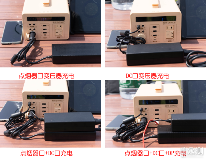 比如,DC+点烟口的充电器一起使用的时候,功率达到了255W,充电仅需4.5H,速度比单独用一个快很多。