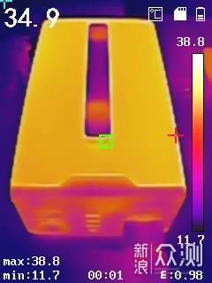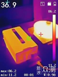 这个测试主要看这个高频谐振技术是否过关,我们一样用电磁炉做测试,电磁炉基本是压着定格功率在跑,用热成像看看,发热并不严重,旁边的锅子已经发烫的厉害了。一个图片中的对比比较有说服力,户外电源外壳是36.9度,而电磁炉上的锅子是86.2度。所以说这个被动散热的模式,大家可以放心使用,电池不会过热。