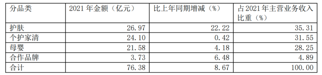 2021年,护肤品业务收入同比增长22.22%,成为公司增长最快的业务板块,在公司收入占比也达到35.31%,超越个护家清业务居第一位。