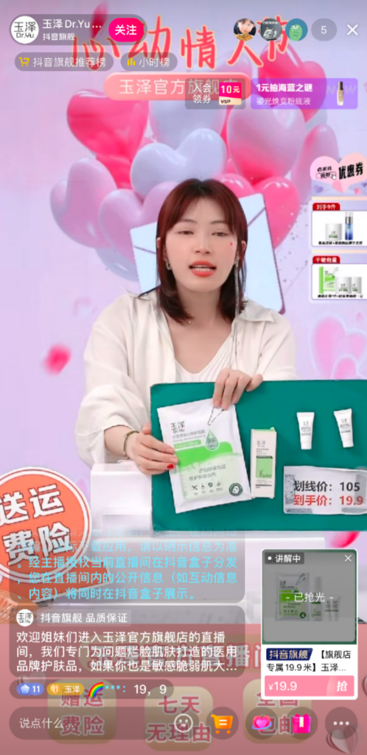 据第一财经商业数据中心统计,2020年1-6月,玉泽与李佳琦合作28场直播,直播日商品交易总额约占该品牌商品交易总额的70%。2020年“618”大促期间,玉泽四次登上李佳琦直播间。