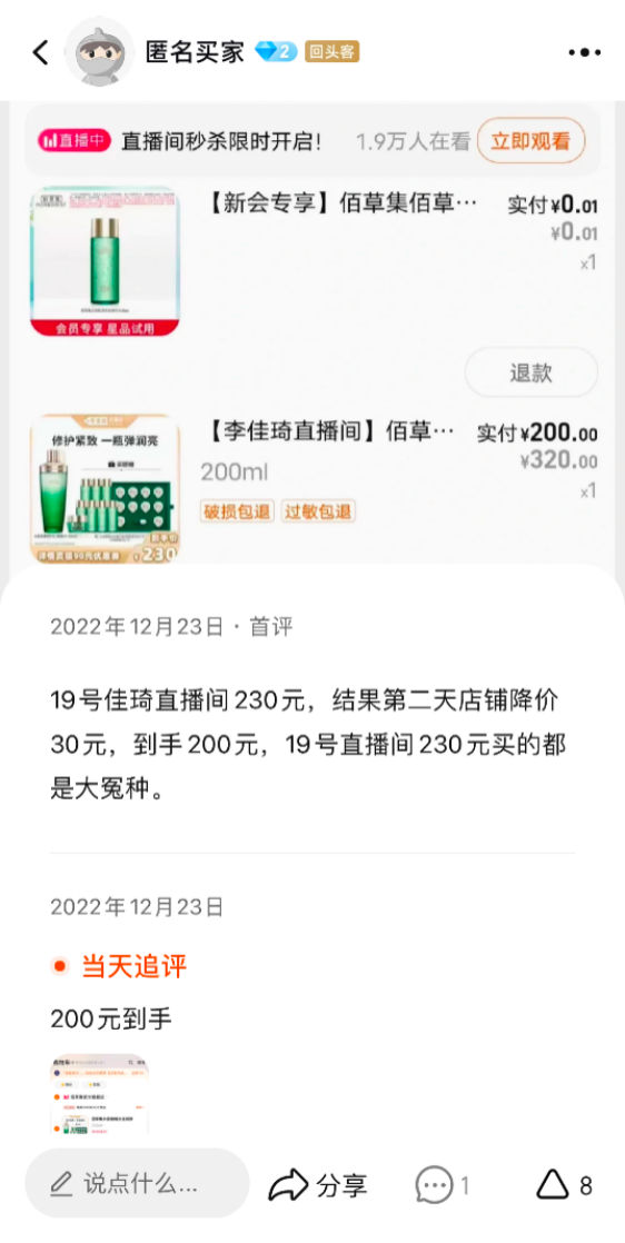 2022年12月,佰草集进入李佳琦直播间,有用户表示,当天在李佳琦直播间230元的到手价格,可以购买到200ml波波水以及一系列赠品。但第二天,同样的产品,在佰草集店铺到手价仅200元。