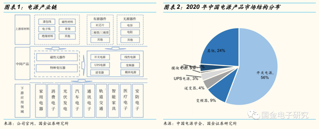 ◾开关电源:又称交换式电源,是一种高频化电能转换装置,其功能主要是将一个位准的电压透过不同形式的架构转换为用户端所需求的电压或电流。开关电源的输入多半是交流电源或直流电源,而输出则是需要直流电源的设备,因此下游主要为消费电子以及工业应用等领域。
