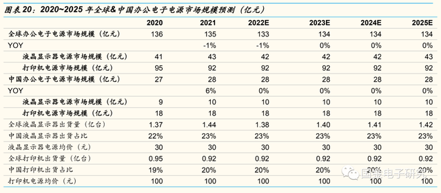 ◾办公电子电源主要包括用于给显示器,打印机等终端设备充电的电源,未来其市场规模将随各国办公需求增长而增长。根据测算,我们预计至2025年全球办公电子电源市场规模将达134亿元,其中液晶显示器电源,打印机电源市场规模分别达43亿元,92亿元。至2025年中国办公电子电源市场规模将达28亿元,2020~2025年CAGR达1.23%,其中液晶显示器电源,打印机电源市场规模分别达10亿元,18亿元。