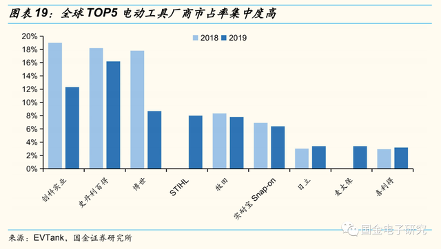 ◾根据EVTank数据,全球TOP5电动工具厂商市场集中度高且已形成较为稳定的竞争格局,2019年市占率为53%,主要玩家依次为史丹利百得,创科实业,博世,STIHL以及牧田,分别占比16.20%,12.30%,8.70%,8.00%,7.80%。中国虽然是电动工具生产大国,但大部分厂商仍以OEM和ODM为主,高端市场被外国厂商长期占据,国内市占率靠前的企业主要有江苏东成以及宝时得等。我们认为下游电动工具厂商市场集中度高有利于大陆电源厂商抢占台湾企业市场份额。