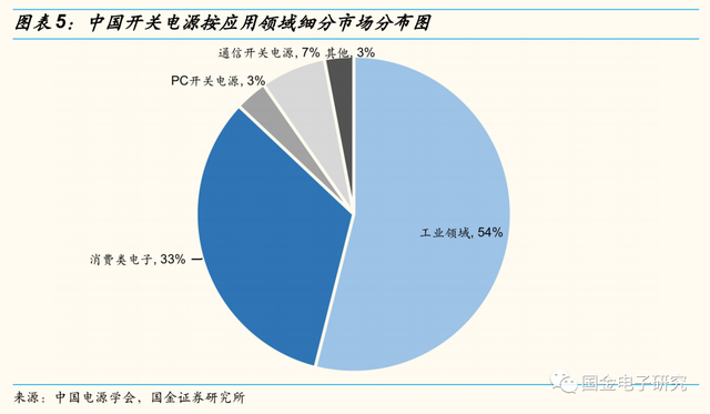 ◾从我国开关电源的应用领域来看,目前工业领域占比最高、达54%,其次为消费电子、通信以及PC,分别占比33%、7%、3%。