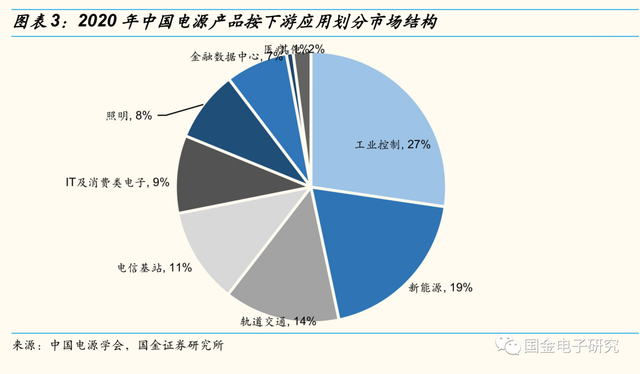 ◾电源产品下游应用领域广泛,根据中国电源学会数据,工业控制和新能源行业市场规模占比最高,分别为27%、19%,其他依次为轨道交通、电信基站、IT及消费电子,分别占比14%、11%、9%。