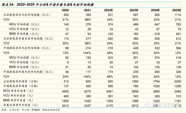 ◾我们预计至2025年全球新能源车电控市场规模将达1114亿元,2020~2025年CAGR为41%,其中MCU达783亿元,VCU达70亿元,BMS达261亿元;全球车载电源市场规模达612亿元,2020~2025年CAGR达41%。预计至2025年中国新能源车电控市场规模将达594亿元,2020~2025年CAGR达47%;中国车载电源市场规模达326亿元,2020~2025年CAGR达47%。