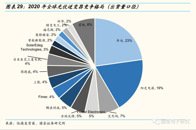 ◾我们看好国内电源企业凭借制造能力拓张至逆变器代工领域。光伏逆变器行业壁垒主要为资质壁垒和品牌壁垒,前者强制要求光伏逆变器制造商通过全球多重认证要求,耗时较长,程序复杂,而后者主要体现在逆变器客户倾向于选择行业龙头作为供应商,因此行业新进者想要在短期内与下游客户建立长期合作十分困难。根据伍德麦肯兹统计,国内光伏逆变器市场份额主要被华为以及阳光电源占据,市占率分别为23%,19%。
