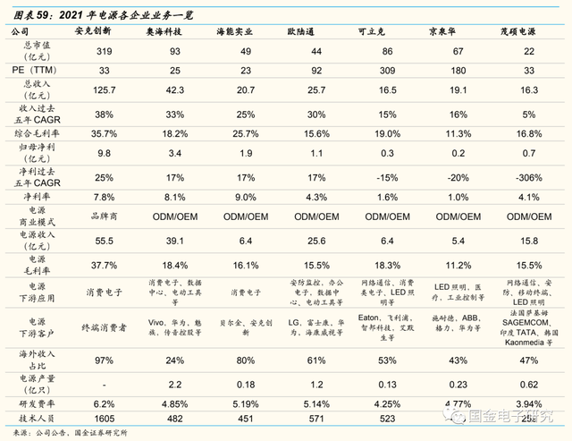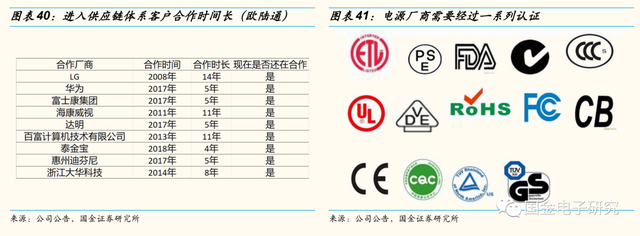 ◾ 壁垒端:技术+客户+规模+品牌壁垒高,行业先发优势明显。1)技术壁垒高主要体现在定制化难度高,下游产品迭代速度快两方面。2)客户认证周期长达1~2年,且各国安规标准也有所差异,认证周期较长。3)电源行业具有明显规模效应,规模更大的企业在成本控制,市场拓张等方面优势明显。4)老玩家产品具有较高知名度,行业品牌壁垒高。