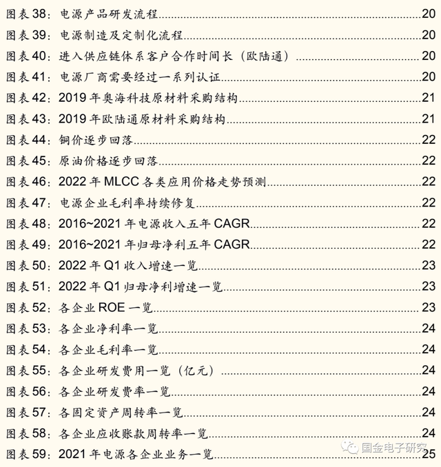◾ 财务端:大陆企业成长性更佳,台达电毛利率、研发费率领先行业。1)从成长性来看,得益于大陆电源厂商逐步实现品类拓张,份额持续提升,过去五年成长性优于台湾大厂,其中奥海科技2016~2021年电源收入、归母净利五年CAGR达35%、17%,领先行业。2022年Q1奥海科技收入、归母净利同增30%、27%,位居第一梯队。2)电源龙头台达电毛利率(28%)、研发费率(9%)领先行业。