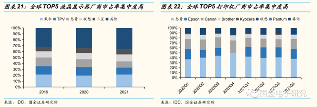 ◾全球TOP5打印机厂商市场占有率近年来持续维持在88%左右,2021年Q4市占率前五厂商分别为惠普,Canon,Epson,Brother以及Pantum,市占率分别为37.90%,20.30%,19.70%,8.10%,2.00%。
