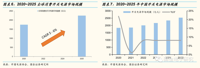 ◾ 未来,伴随手机、PC、服务器电源的需求不断增长,全球及中国开关电源市场规模有望持续保持增长。根据中国电源学会数据,2020年全球消费类开关电源市场总值约1750亿元,预计到2025年将增长至2250亿元,五年CAGR达5%,中国开关电源市场预计将从2020年的1832亿元增长至2025年的2532亿元,期间CAGR达5.5%。
