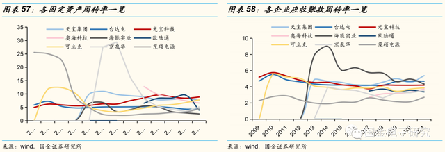 ◾从固定资产周转率来看,各家企业差异较大、但总体保持平稳,2021年台达电为4.4次,光宝最高达8.9次,海能实业最低为2.6次。从应收账款周转率来看,天宝、台达电较高,分别为5.4、4.7次,欧陆通、茂硕电源最低,分别为3.4、2.7次。