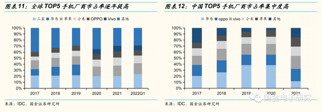 ◾全球TOP5手机厂商市占率逐年提高,从2017年的60.65%增长至2022年Q1的70.93%,而中国TOP5手机厂商市场集中度同样高,2017年至2021年基本维持在75%以上,2021年市占率TOP5分别为vivo,oppo,小米,苹果以及华为,对应市占率分别为21.50%,20.40%,15.50%,15.30%,11.70%。