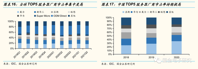 ◾根据IDC数据,全球TOP5服务器厂商市场集中度高,基本维持在50%,主要玩家依次为戴尔,HPE,浪潮,联想和SuperMicro,2021年Q1分别占比16.40%,13.80%,10.10%,6.20%,4.90%。而中国TOP5服务器厂商市占率亦维持在较高水平且呈现逐年增加趋势,2020年市占率为81.20%,主要玩家分别为浪潮,华为,新华三,戴尔以及联想,市占率依次为35.60%,16.80%,15.20%,6.90%,6.70%。我们认为下游服务器厂商集中度高有利于大陆电源厂商快速拓张市场份额。