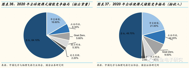 ◾ 从出货量来看,华宝新能市占率全球第一,2020年达16.60%,其次是正浩科技、GoalZero,分别达6.30%,5.60%。从营业收入来看,仍是华宝新能排名第一,2020年市占率达21%。便携式储能目前处于行业发展初期,市场集中度不高,2021年TOP5为35.90%(按出货量)。我们看好部分头部电源类企业未来凭借自身长期电源技术积累优势快速抢占市场份额。