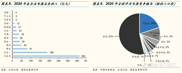 ◾ 台湾厂商目前占据开关电源主要市场份额,大陆电源厂商成本控制、服务能力更佳,未来有望快速抢占市场份额。全球电源产业已经基本转移至我国,台湾厂商因进入时间较早,技术积累丰富,占据市场大部分份额,2020年台达电、光宝、群光、康舒电源产品收入达360、189、81、49亿元,市占率达37%。