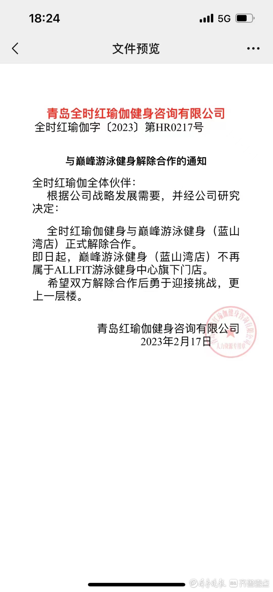 通过孙姓销售经理的微信朋友圈,记者的确看到了他转发的一份《与巅峰游泳健身解除合作》的通知。通知称:根据公司战略发展需要,并经公司研究决定,全时红瑜伽健身与巅峰游泳健身(蓝山湾店)正式解除合作。即日起,巅峰游泳健身(蓝山湾店)不再属于ALLFIT游泳健身中心旗下门店。通知落款时间为2023年2月17日,并盖有青岛全时红瑜伽健身咨询有限公司的人力资源专用章。