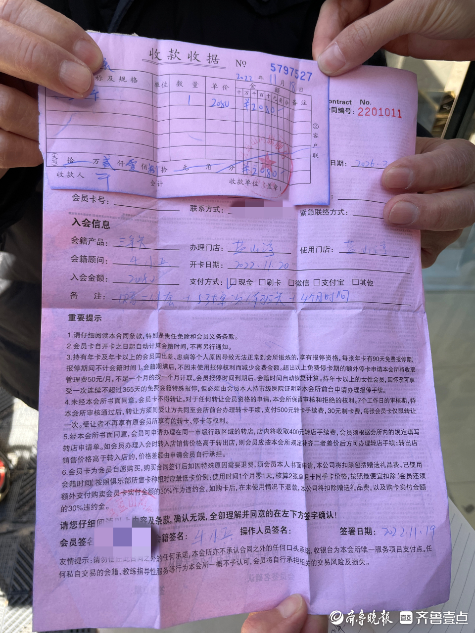 “我们俩都过来四趟了!还关着门,电话也打不通,看来这钱真要打水漂了。”说起这事儿,76岁的张强(化名)难掩气愤。张强告诉记者,他虽然年近八旬,但爱好游泳,常年坚持运动,身体还不错。去年11月底,他通过宣传单页了解到了这家健身俱乐部。“我主要是去游泳,我看着宣传单页上这家条件还可以,而且从家里有直达的车过来。那会还有‘双十一’的促销活动,就办了一张年卡。”张强从口袋里拿出了他去年和这家健身俱乐部签订的会籍合同和收款收据。他办理的是一张三年卡,价值2080元,开卡日期为2022年11月20日。不巧的是,张强办完卡之后就遇到了疫情。随后,他收到了俱乐部的通知:泳池需要设备维修,自2022年12月7日-2023年2月6日期间暂停使用。不过,到2月6日,巅峰游泳健身荟并未如期开门。期间,张强和同时期办卡的好朋友老刘,多次来现场查看,都没看到人。“我在微信上问给我办卡的人和健身俱乐部的经理,都不回复我。卡一次都没用就关门了!”