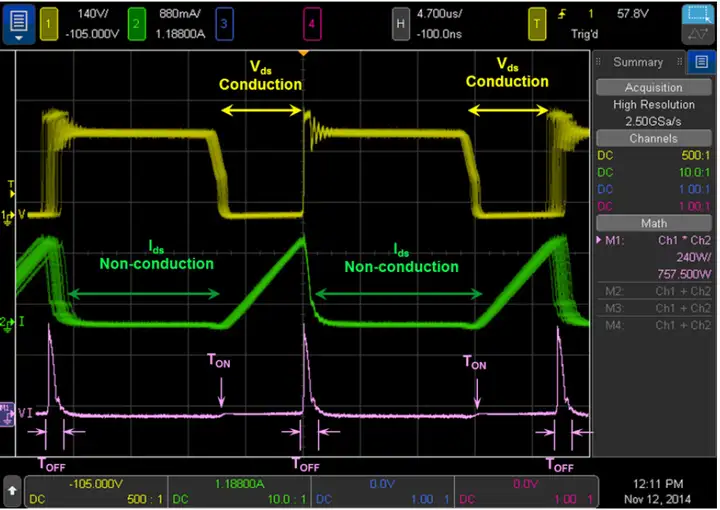 一旦验证了输入功率符合您的技术指标要求,下一步就是检测电源的开关元件。理想条件下,开关电源没有任何开关损耗。但是,电源中使用的晶体管在实际中不可能符合理想条件,因此在开关断开和闭合时总会有一些功耗。如果能够分析开关在断开或闭合过程中损耗了多少功率,就能帮助您改进设计,尽量减少该损耗。