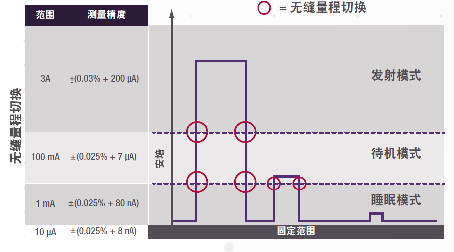通过无缝量程,您能够从一个电流量程流畅地切换到另一个电流量程,电源输出中不会出现毛刺或中断。对于各种待机(低电流)和发射(高电流)状态重复切换的器件来说,这一特性对它们的功率和电池优化测量非常重要。图 3.2 是通过无缝量程测量动态电流的示意图。