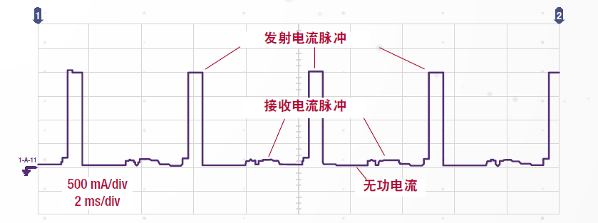 测量这些器件电流消耗的主要挑战是电流信号有很宽的动态范围。移动器件通常在活动状态之间来回切换,在活动状态,器件牵引非常高且快速的峰值电流,而在空闲或待机电流模式中,器件只牵引非常小的直流和交流电流。图 3.1 显示了对通话中的 GSM 手机进行的漏电流测量。活动电流峰值高达 2A,但在空闲模式下,漏电流极小。通常来说,要精确测量该信号非常困难。