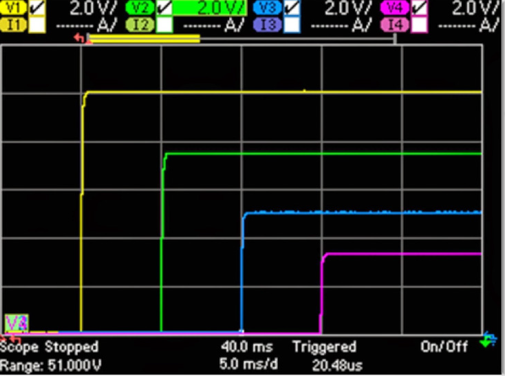 在本例中,电源分析仪正在仿真 4 路输出电源。这四路电源输出分别供应 10 V、7.5 V、5 V 和 3.3 V 电压,同时时延分别设置为 5 ms、10 ms、15 ms 和 20 ms。如需进一步测试,您还可以单独设置每路输出的输出电压上升时间(压摆率)。图 3.4 显示了电源分析仪内置示波器的实际信号输出。