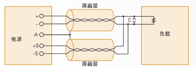使用屏蔽双绞线作为输出和远程感应导线,从而尽量减少辐射(电子和磁性)干扰。为了确保屏蔽线不携带电流,只将屏蔽线的一端接地,首选电源单点接地(图 3.8)。